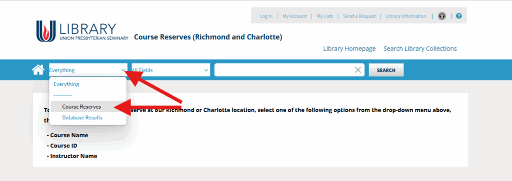 From the Course Reserves page, select Course Reserves from the Everything dropdown