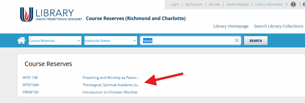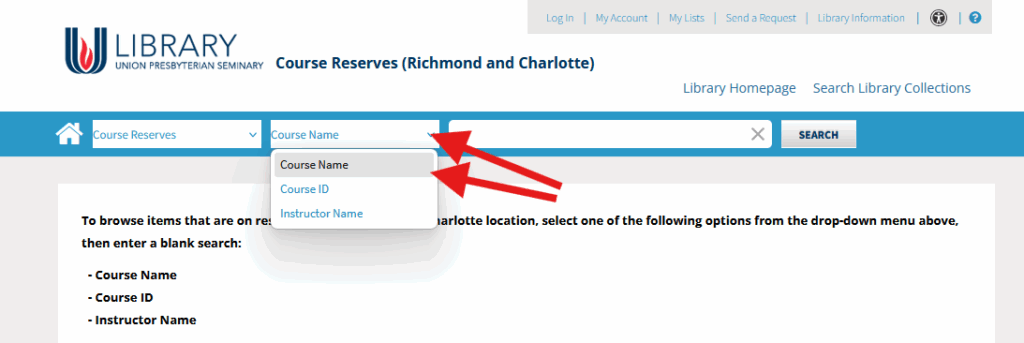 To browse items that are on reserve at our Richmond or Charlotte location, click the Course Reserves link beside the main search bar on our home page.