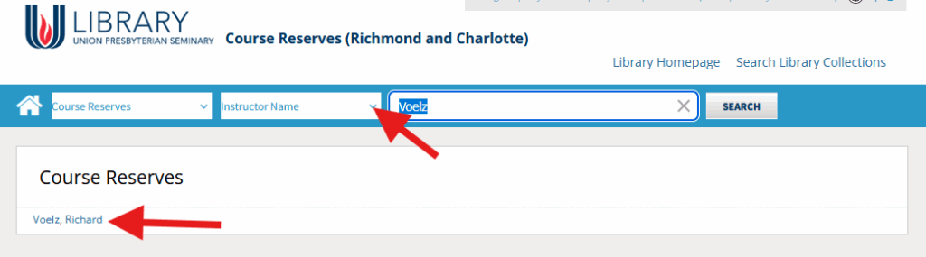 From the search results select instructor, course name, or course ID. In this case, I have selected the instructor’s name which gives me all the courses for which this instructor has reserve items.